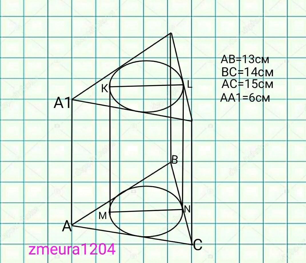 У трикутну призму вписано циліндр, висота якого дорівнює 6 см, сторони основи якої дорівнюють — 13 см, 14 см, 15 см. Знайдіть: 1) півпериметр основи призми; 2) площу основи призми; 3) радіус циліндра; 4) площу осьового перерізу циліндра; 5) діагональ осьового перерізу циліндра; 6) площу повної поверхні призми; 7) площу поверхні циліндра; 8)об’єм циліндра; 9) об’єм призми.