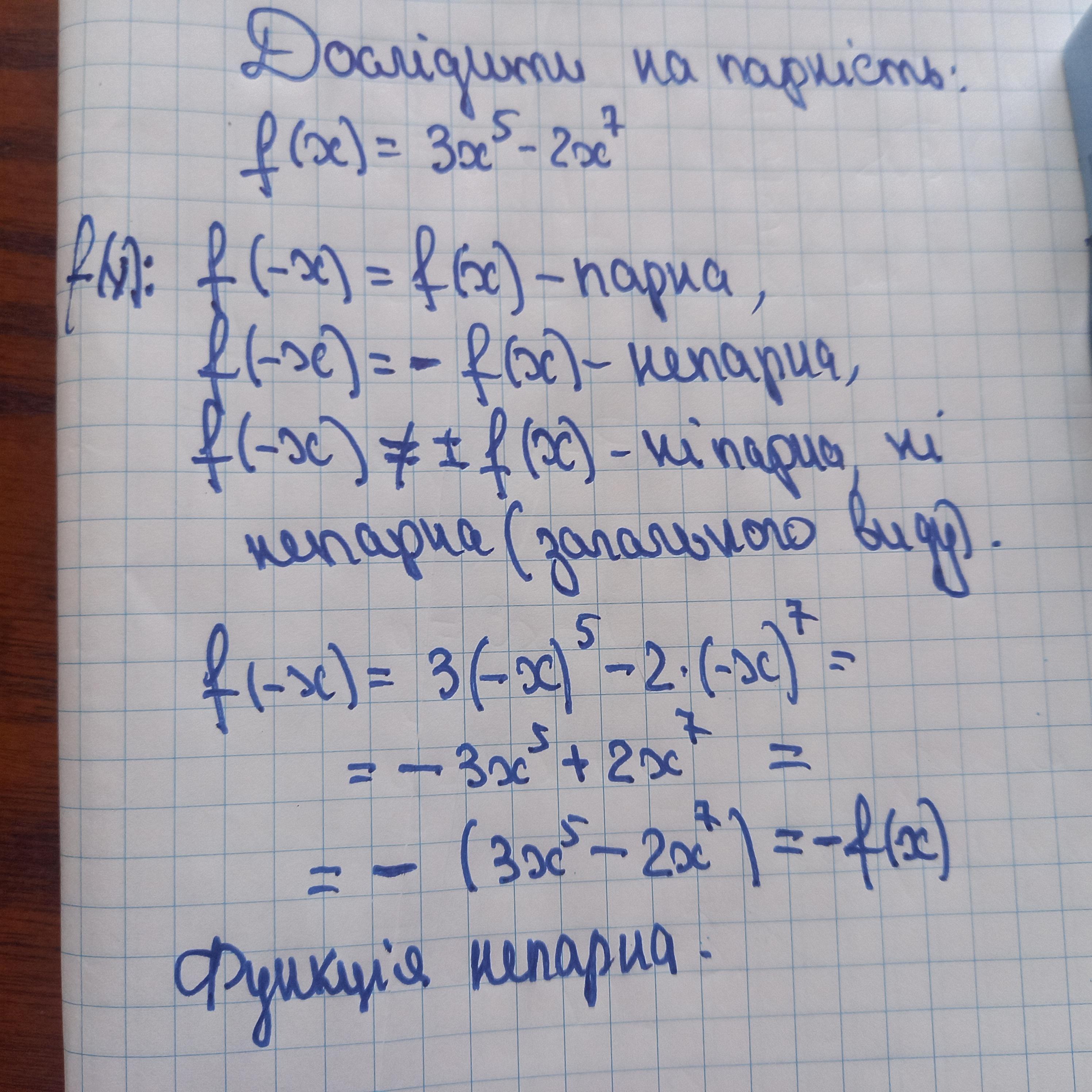 Ми бачимо, що f(x) = 3x⁵ - 2x⁷ дорівнює -f(-x) = 3x⁵ - 2x⁷. Отже, функція f(x) = 3x⁵ - 2x⁷ є непарною.