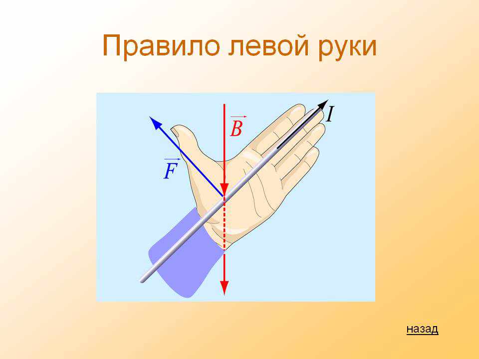 находящийся в магнитном поле проводник с током. Если ладонь левой