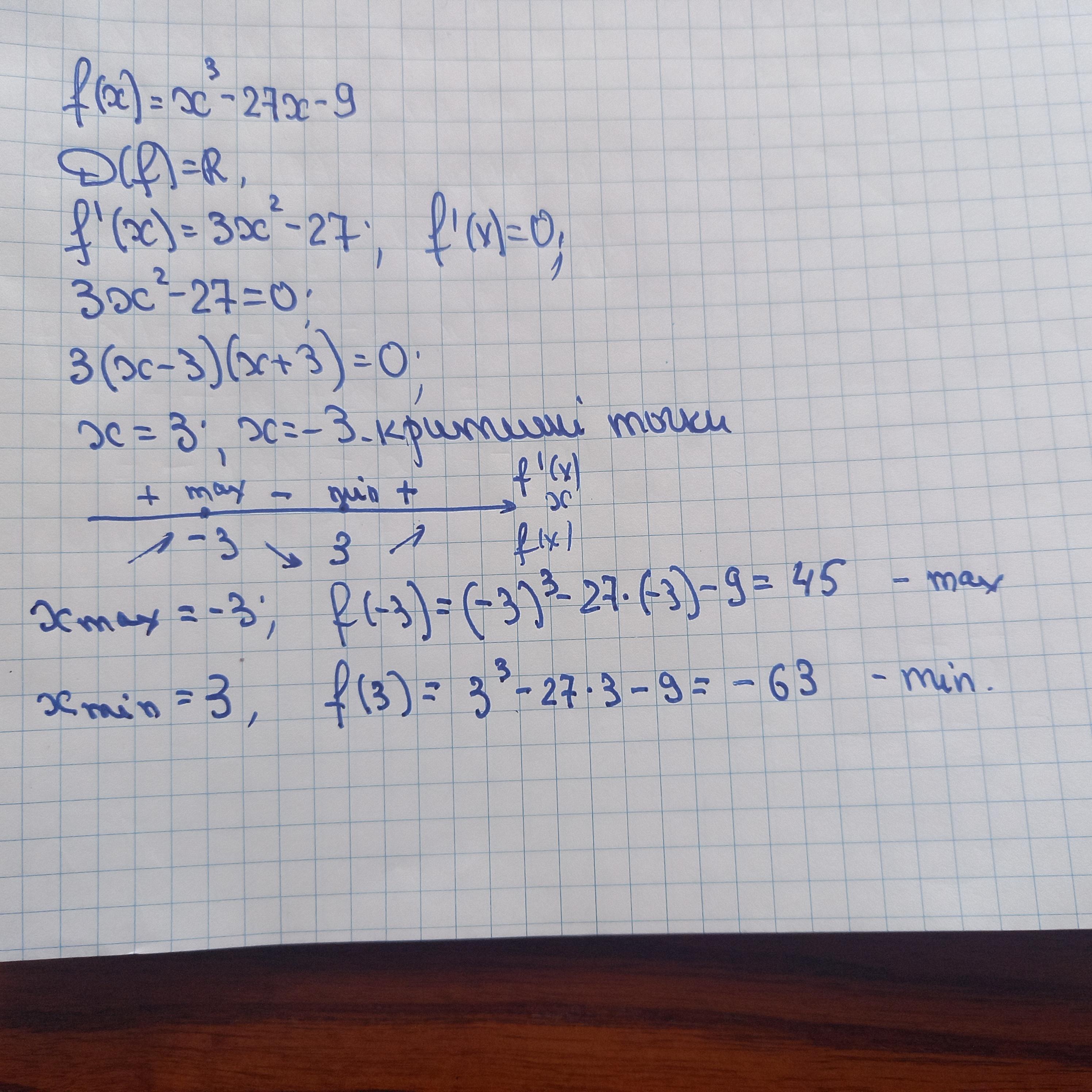 Отже, ми знайшли два екстремуми функції f(x) = x^3 - 27x - 9: мінімум у точці x = 3 та максимум у точці x = -3.