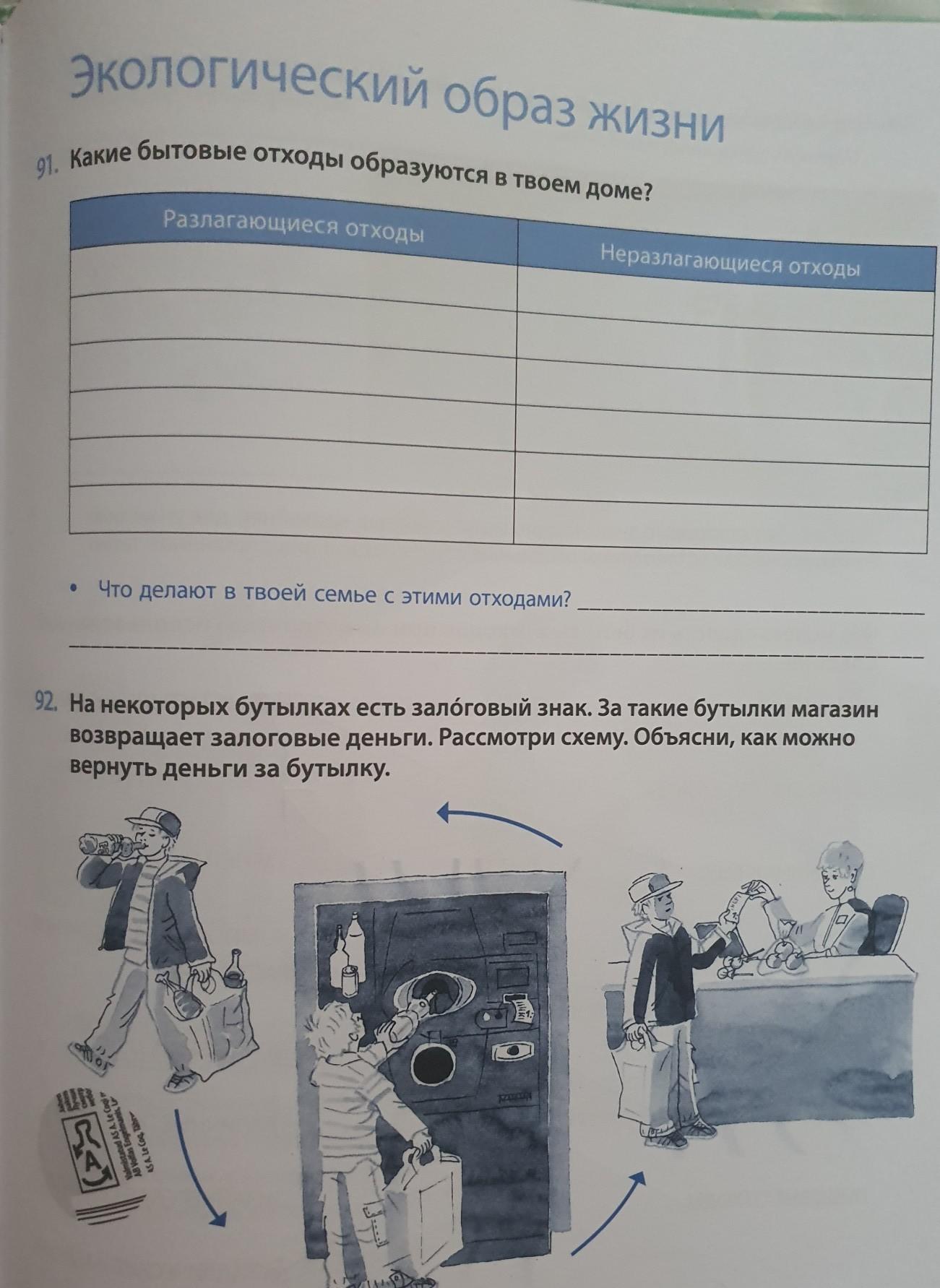 92.Для начала мы смотрим есть ли знак вторичной переработки на коробке ,бутылке и т.д .Далее мы находим Фандомат (это аппарат по приему пластиковых бутылок и алюминиевых банок).Помещаем бутылку в специальное отверстие.Фандомат посчитывать стоимость всех отходов ,и выдаёт вам деньги.После чего можно пойти и купить такую же бутылку и вернуть стоимость таким же образом:)))