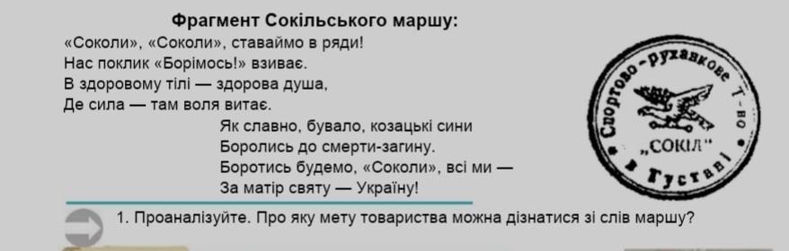 Зі слів маршу можна зрозуміти, що метою товариства, яке відзначається в тексті, є підтримка фізичного та духовного здоров'я, сили, волі та високих моральних цінностей. Зазначається, що козацькі сини, про яких йдеться, боролися до смерті-загину, і надалі Соколи, які є частиною цього товариства, також будуть боротися за Русь і святу Україну. Таким чином, метою товариства є просування національних і культурних цінностей, захист і збереження історичної спадщини та зміцнення фізичного та духовного стану українського народу.