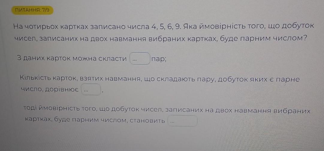 Є 6 можливих комбінацій двох карток: (4,5), (4,6), (4,9), (5,6), (5,9), (6,9).