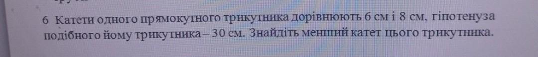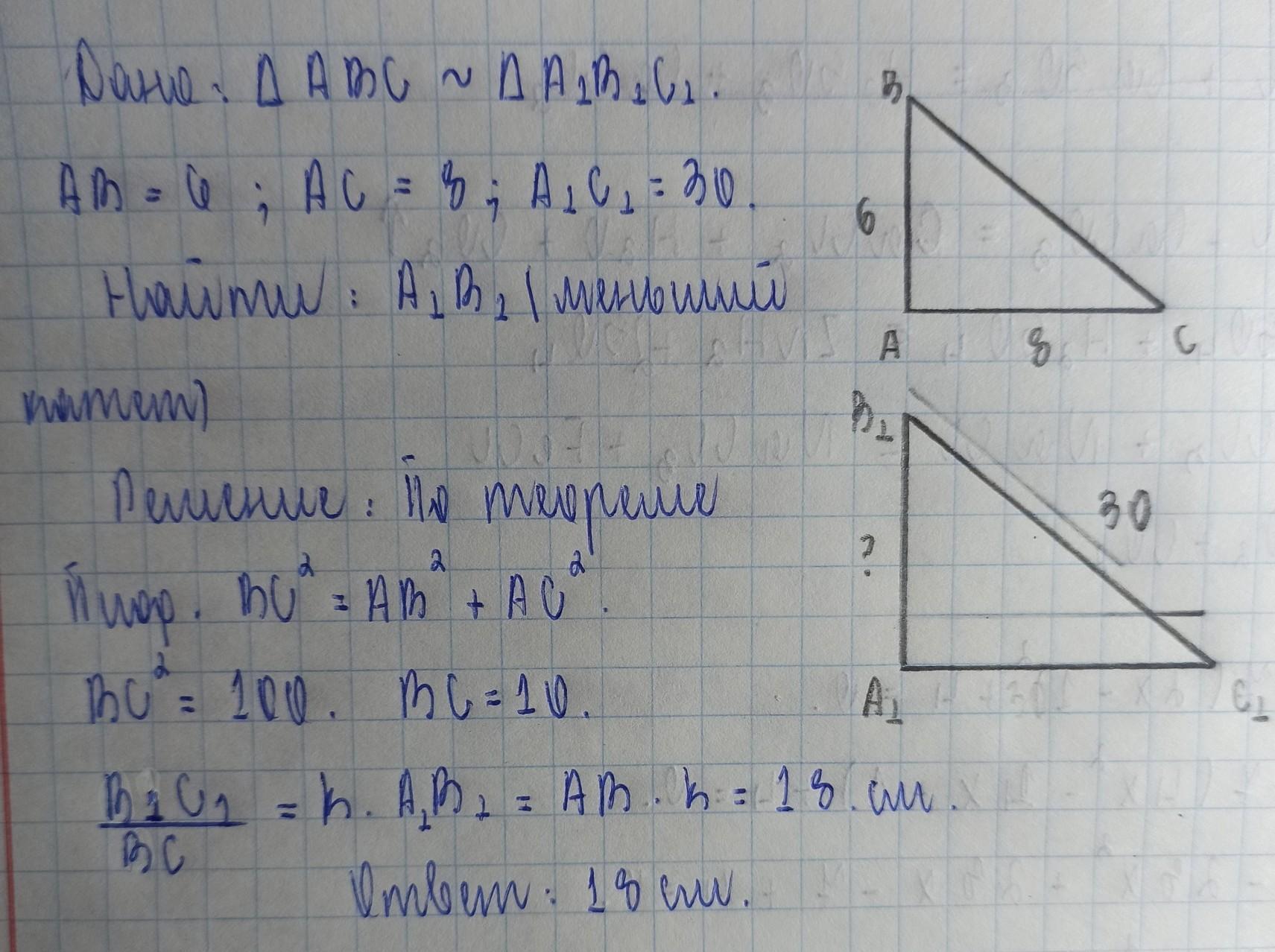 по т пифагора меньшая гипот 10 коеф подобия 3 отсюда меньш катет 6х3=18