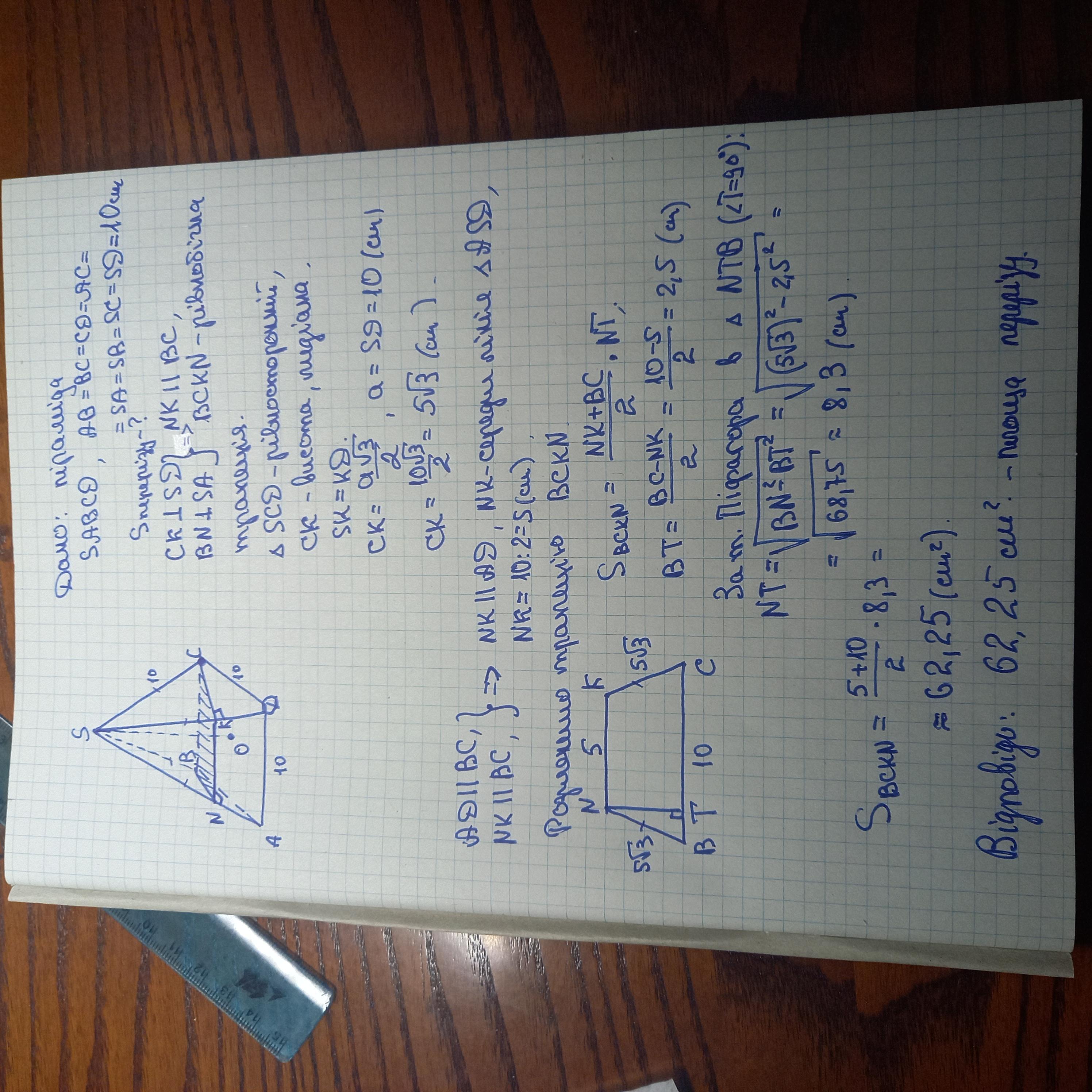 Знайдіть площу перерізу, якщо ребро піраміди дорівнює 10 см.
