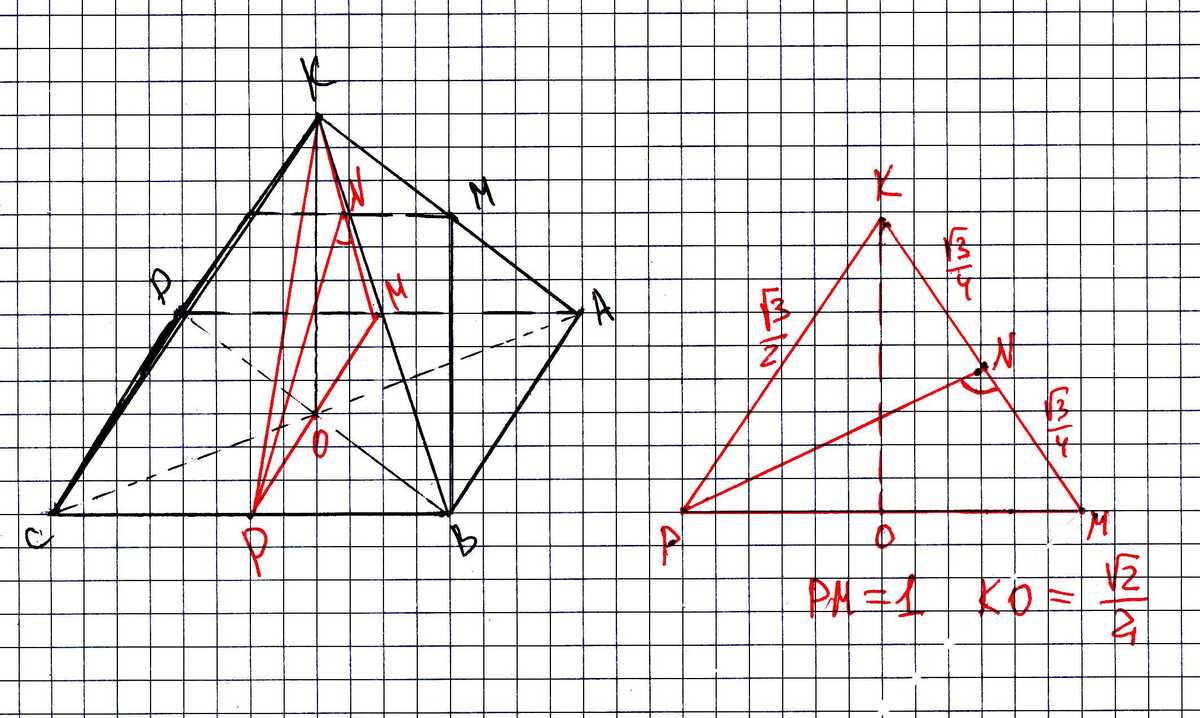 В правильной четырехугольной пирамиде КАВСД, все ребра которой равны 1, найдите косинус угла между плоскостями КАД И ВСМ, где М-середина ребра АК