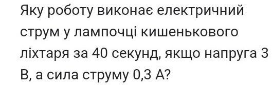Яку роботу виконає електричний струм у лампочці кишенькового ліхтаря за 40 секунд, якщо напруга 3 В, а сила струму 0,3 А? СРОЧНО!!!!!!!!
