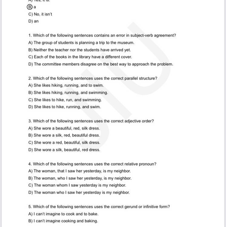 - A) She wore a beautiful, red, silk dress. (Correct adjective order)