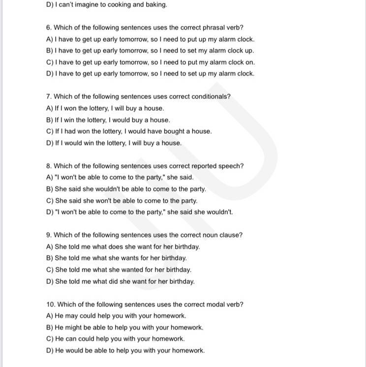 6. D) I have to get up early tomorrow, so I need to set up my alarm clock.