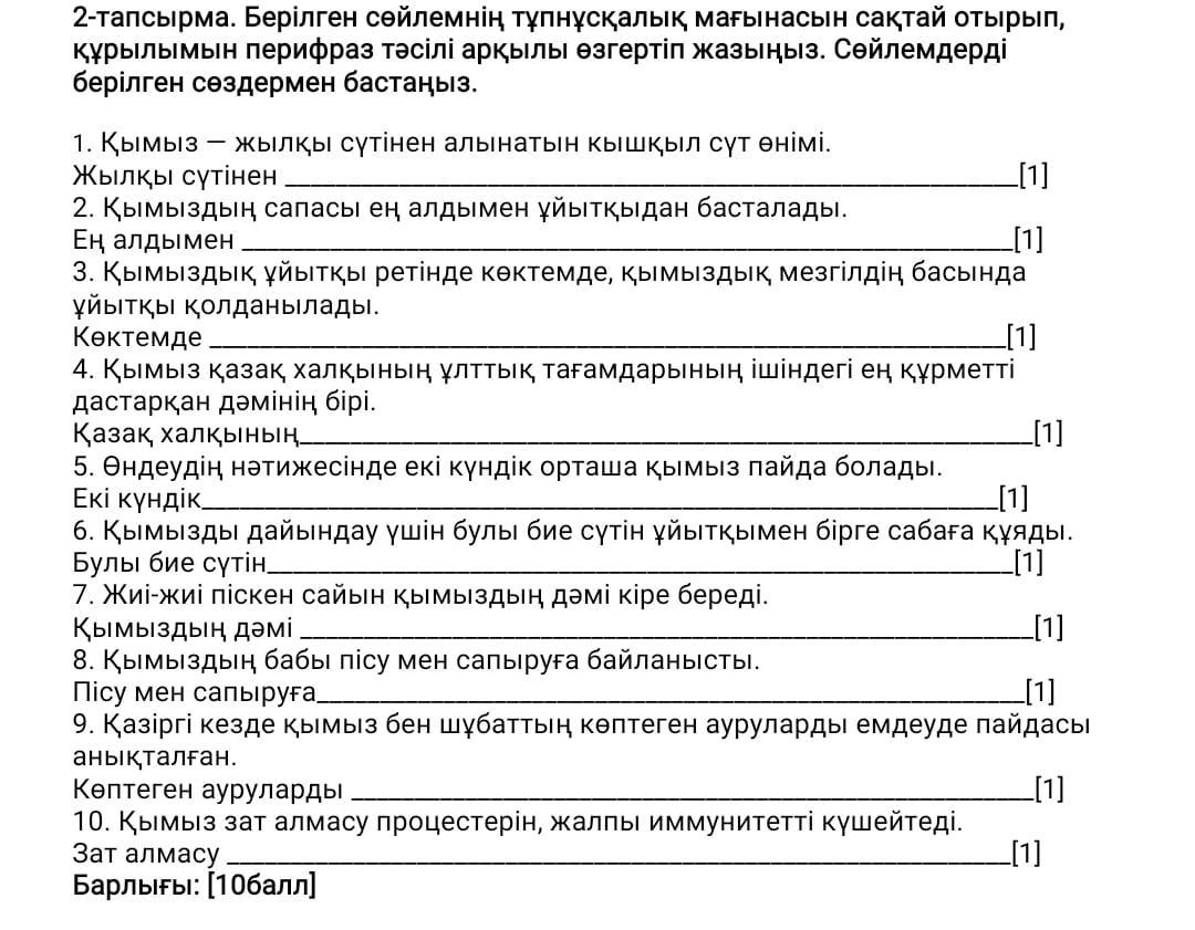 1.Жылқы сүтінен алынатын қышқыл сүт өнімі қымыз деп аталады.