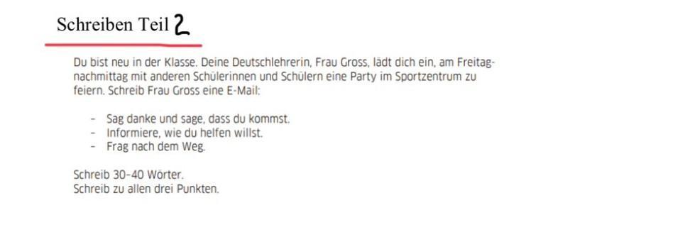 Schreiben Teil 2 Du bist neu in der Klasse. Deine Deutschlehrerin, Frau Gross, lädt dich ein, am Freitag- nachmittag mit anderen Schülerinnen und Schülern eine Party im Sportzentrum zu feiern. Schreib Frau Gross eine E-Mail: Sag danke und sage, dass du kommst. Informiere, wie du helfen willst. - Frag nach dem Weg. Schreib 30-40 Wörter. Schreib zu allen drei Punkten.