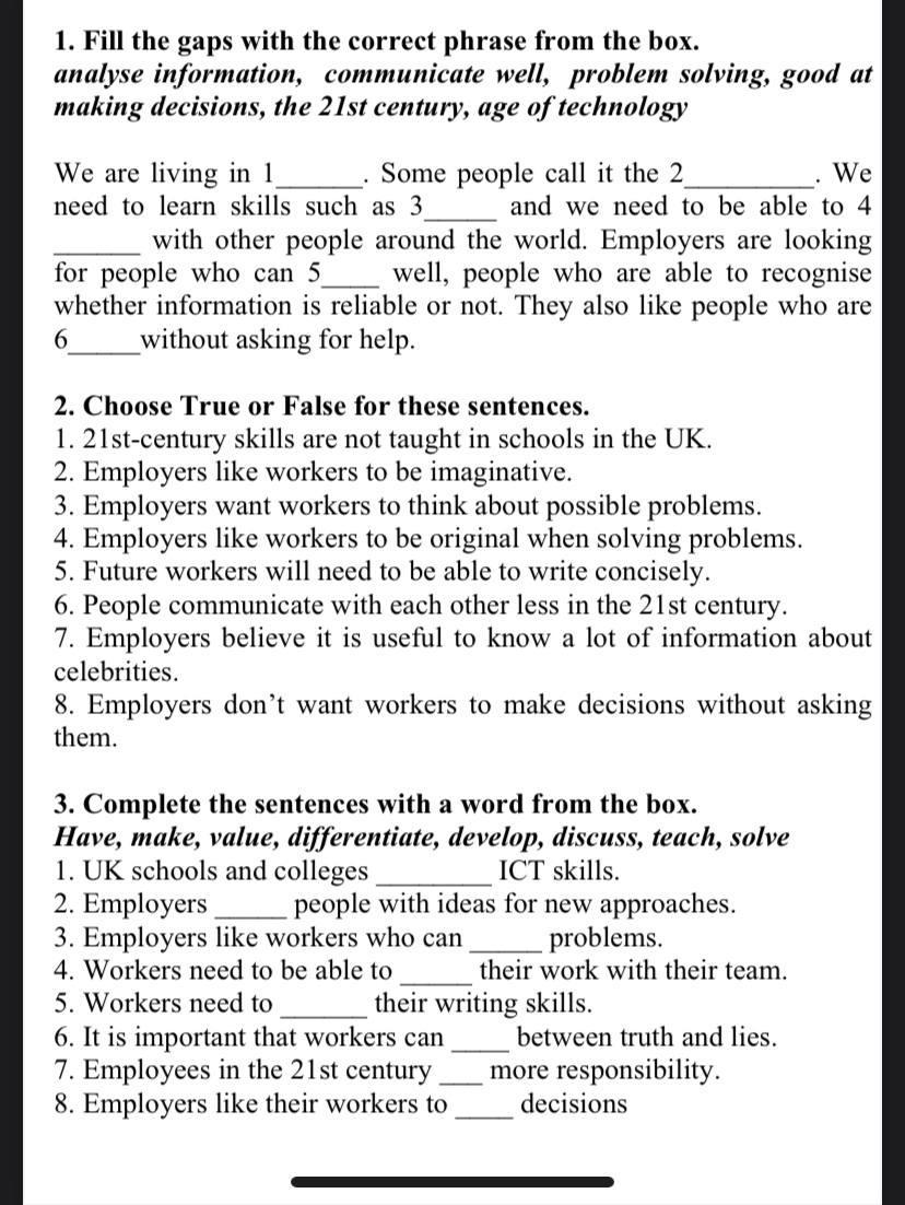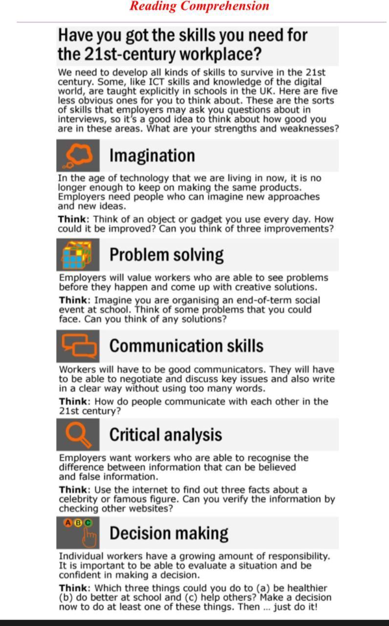 1. We are living in the 21st century. Some people call it the age of technology. We need to learn skills such as problem-solving, and we need to be able to communicate well with other people around the world. Employers are looking for people who can analyze information well, people who are able to recognize whether information is reliable or not. They also like people who are good at making decisions without asking for help.