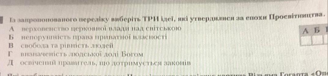 В. свобода та рівність людей; Г. верховенство світської влади над церковної;