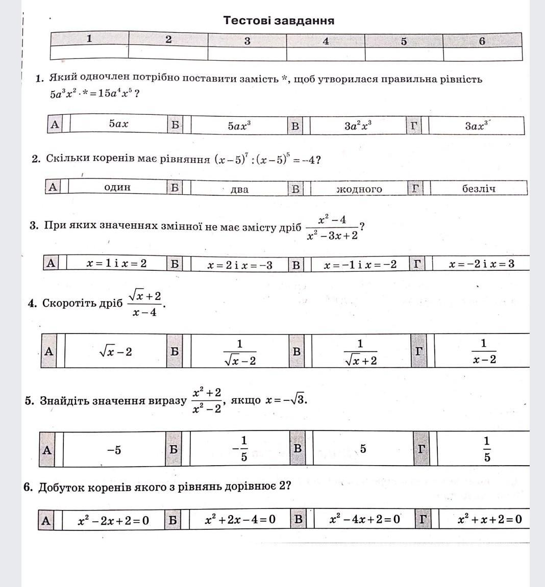 1. Який одночлен потрібно поставити замість *, щоб утворилася правильна рівність 5a³x².*=15a³x³ ? A A A 2. Скільки коренів має рівняння (x-5)7: (x-5) =--4? 5ax A один 4. Скоротіть дріб A x=1ix = 2 A 3. При яких значеннях змінної не має змісту дріб Б Jx+2 x-4 x-2 -5 Б 5. Знайдіть значення виразу Б Б Б 5ax3 x² - 2x+2=0 Б два x² +2 x² - 2 x = 2 i x = -3 1 x-2 В 2 якщо x=-1 1 5 6. Добуток коренів якого з рівнянь дорівнює 2? В В :-√√3. в В За²х³ жодного x2-4 -? -3x+2 x = -1 ix = -2 1 Tx+2 5 x²+2x-4-0 B x² -4x+2=0 Г T r Г Г Зах3 безліч x=-2ix = 3 1 x-2 15 x² +x+2=0