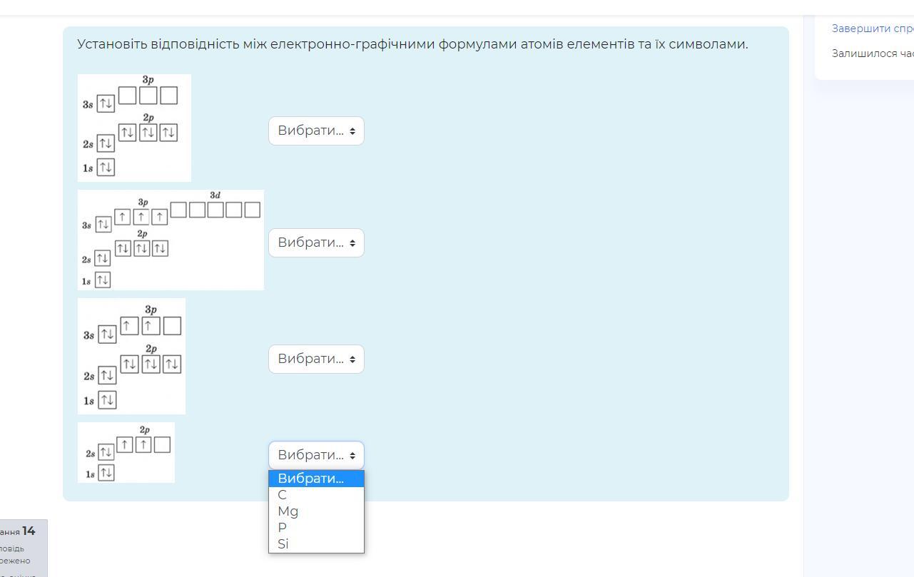 Установіть відповідність між електронно-графічними формулами атомів елементів та їх символами.