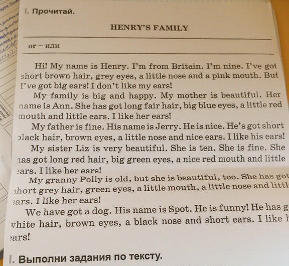 2) Truе (правда) / Falsе (неправда). 1. Henry has got short hair. 2. Henry has got big ears. 3. His mother isn't beautiful. 4. His father has got long hair. 5. His sister has got a red mouth 6. His grandmother is old. 7. Henry likes his ears.
