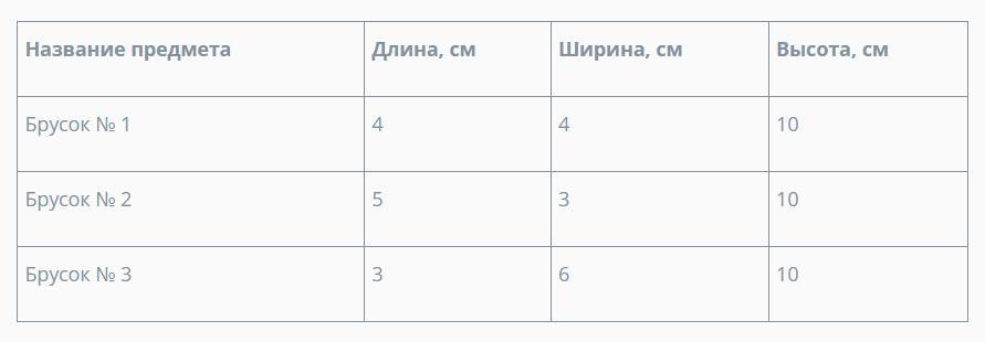 В таблице приведены бруски и их габаритные размеры. Бруски помещают в воду с плотностью ρ = 1000 кг/м3. Считая, что g = 10 Н/кг укажите номера брусков, на которые действует сила Архимеда более 1,55 Н.