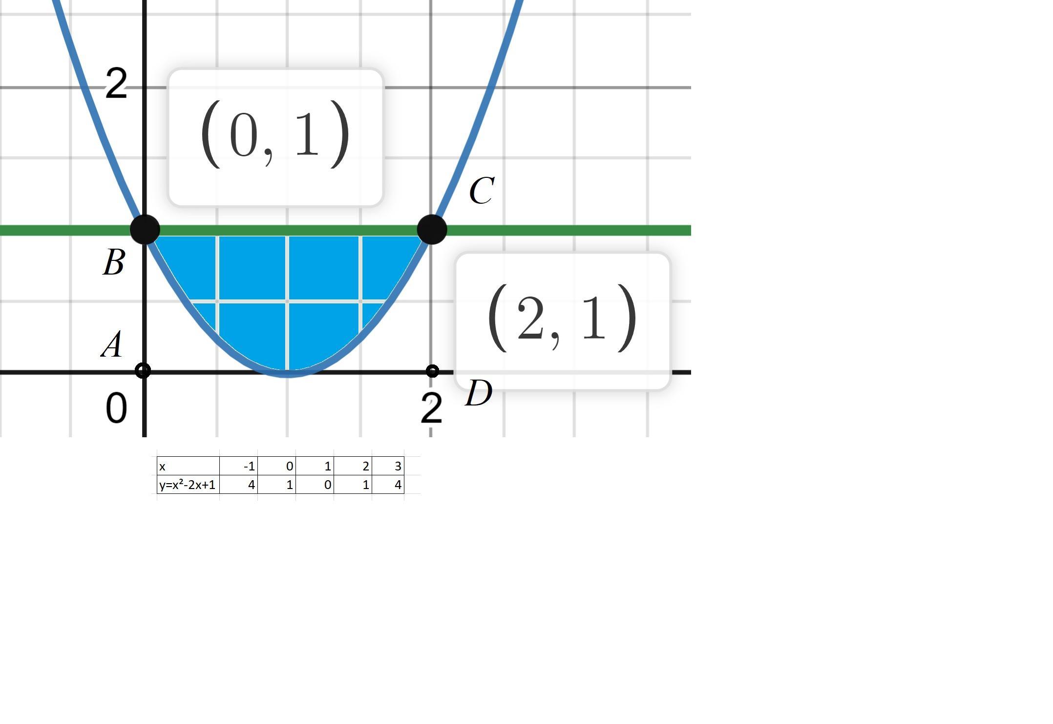 S=∫ₐᵇg(x)dx - ∫ₐᵇf(x)dx=∫₀²dx -∫₀²(x²-2x+1)dx=