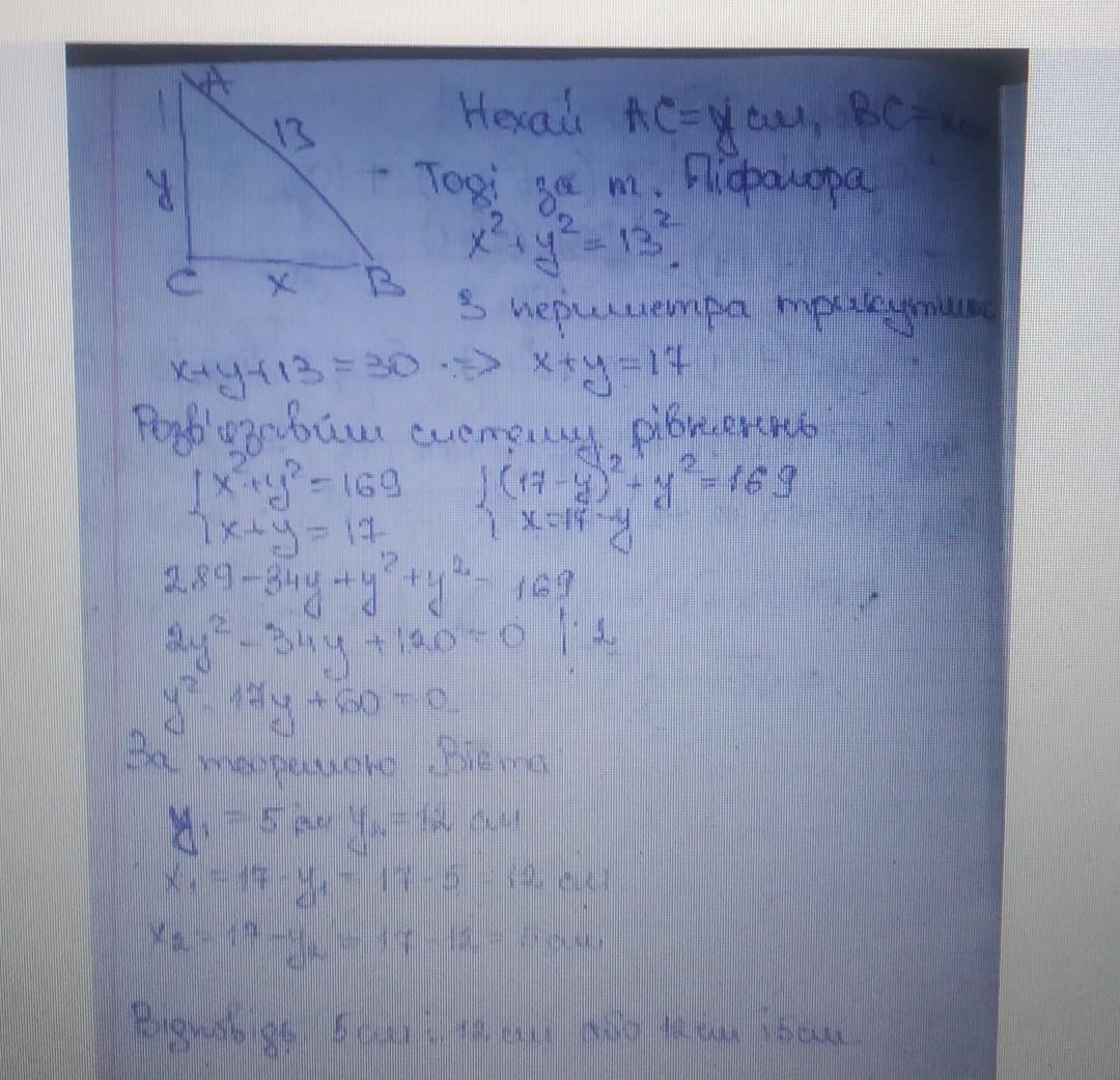 СРОЧНО Периметр прямокутного трикутника дорівнює 40 см , а гіпотенуза на 23 см менша за периметр . Знайти катети прямокутного трикутника .