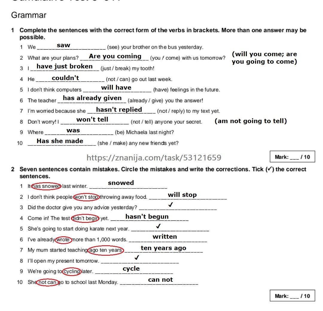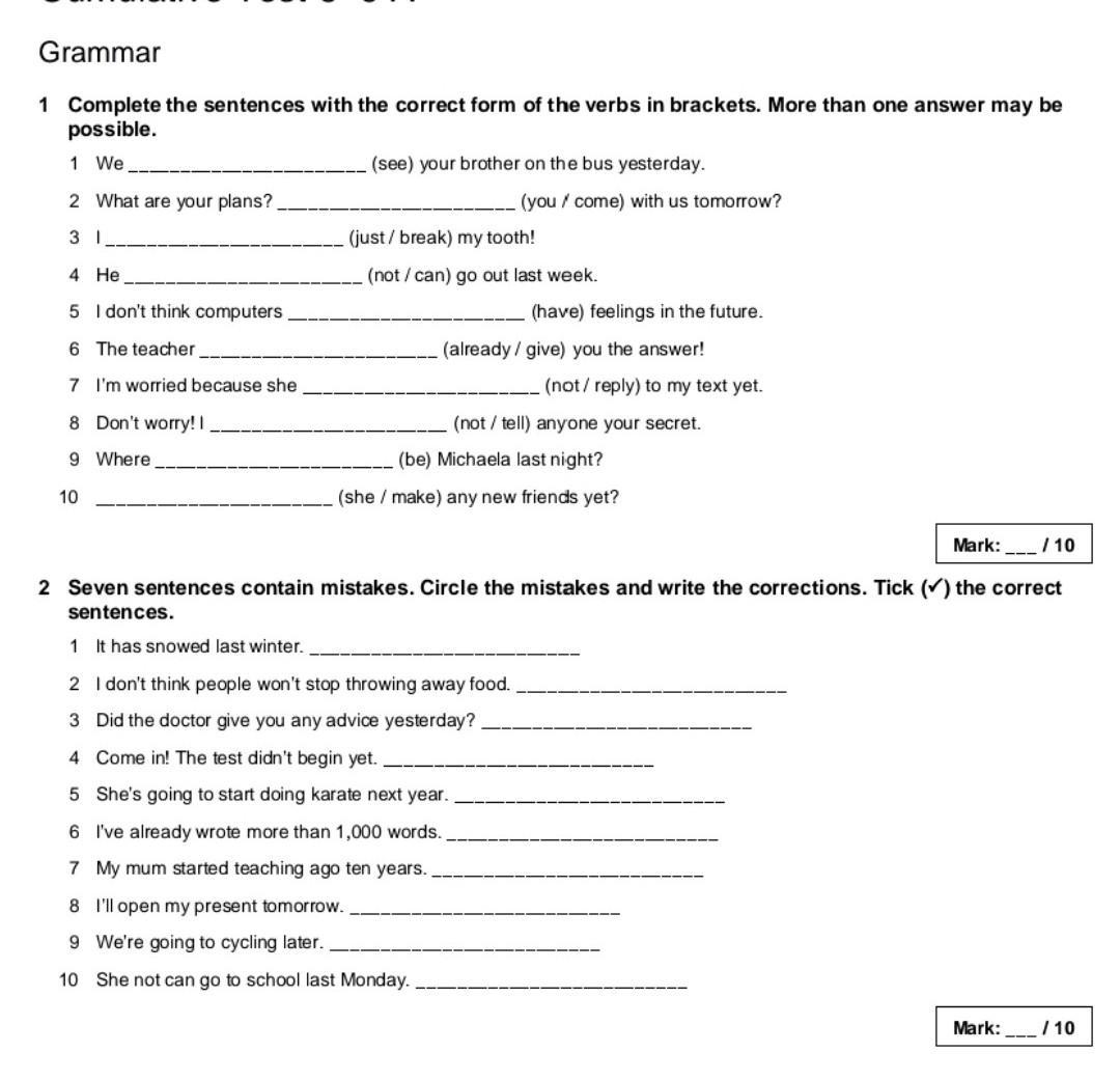 Solutions Third Edition Cumulative Test 6-9 A Grammar 1 Complete the sentences with the correct form of the verbs in brackets. More than one answer may be possible. 1 We 2 What are your plans?. 31 4 He 5 I don't think computers. 6 The teacher. 7 I'm worried because she 8 Don't worry! I 9 Where 10 (see) your brother on the bus yesterday. (just / break) my tooth! (not/can) go out last week. (you come) with us tomorrow? (have) feelings in the future. (already/give) you the answer! .(not/ reply) to my text yet. (not/ tell) anyone your secret. .(be) Michaela last night? (she/ make) any new friends yet? 2 I don't think people won't stop throwing away food. 3 Did the doctor give you any advice yesterday? 4 Come in! The test didn't begin yet. 5 She's going to start doing karate next year. 6 I've already wrote more than 1,000 words. 7 My mum started teaching ago ten years. 8 I'll open my present tomorrow. 9 We're going to cycling later. 10 She not can go to school last Monday. Mark:/10 2 Seven sentences contain mistakes. Circle the mistakes and write the corrections. Tick (✓) the correct sentences. 1 It has snowed last winter. Mark: /10
