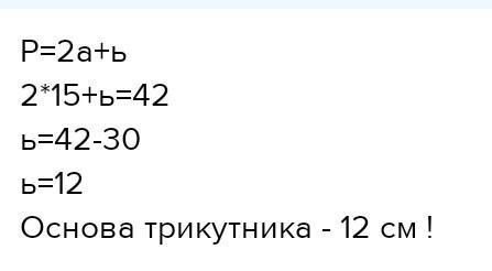 Периметр рівнобедреного трикутника дорівнює 42см. Бічна сторона 12 см. Знайдіть основу трикутника.