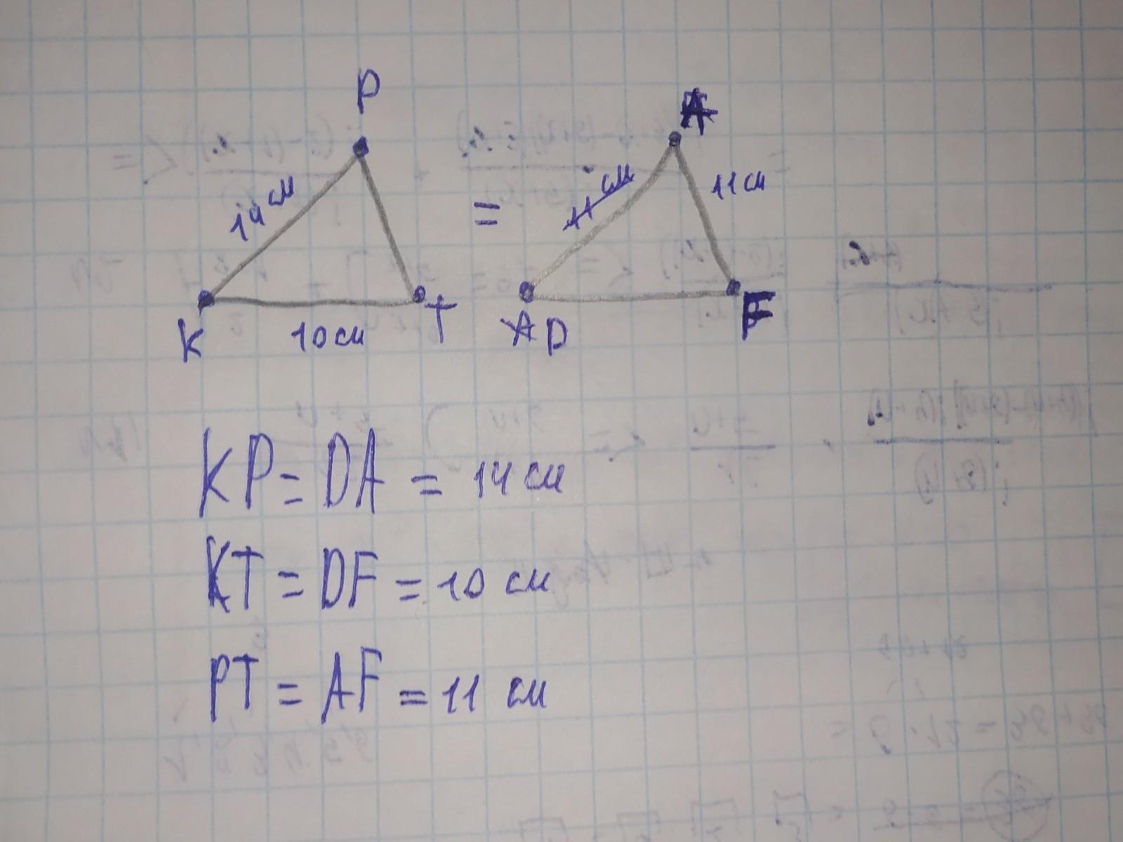 Дано=∆PTK=∆AFD, TK=10см, PK=14см, AF=11см.Знайдіть довжини всіх інших сторін трикутників PTK і AFD