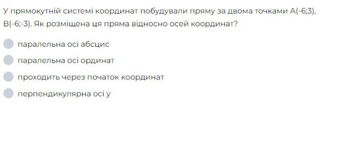 СРОЧНО ДАЮ 50 БАЛОВ!!!!! У прямокутній системі координат побудували пряму за двома точками A(-6;3), В(-6;3). Як розміщена ця пряма відносно осей координат? паралельна осі абсцис паралельна осі ординат проходить через початок координат перпендикулярна осі у