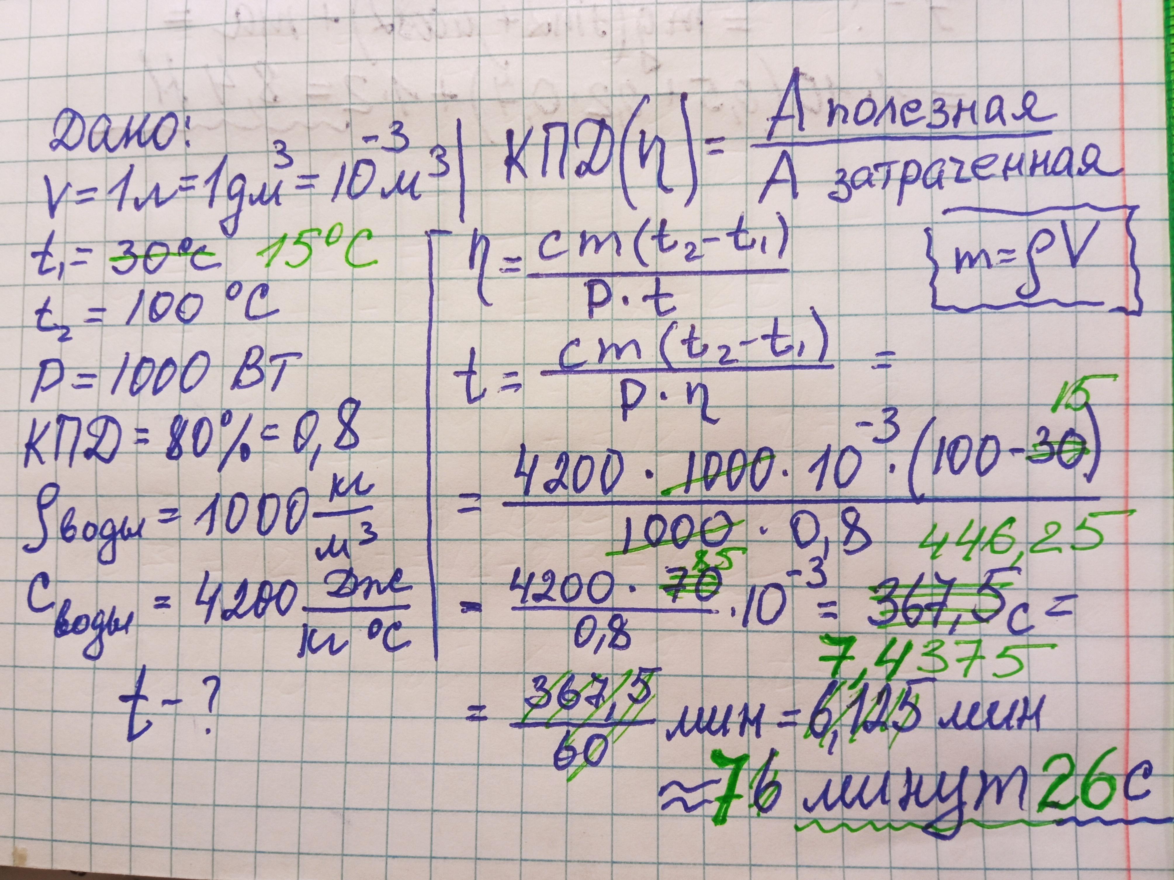 t=cρV(t2-t1)/(Рη)=4200*1000*0,001*(100-15)/(1000*0,8)=446,25с