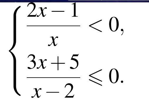 \displaystyle\bf\\\left \{ {{ \frac{2x - 1}{x}  < 0} \atop { \frac{3x + 5}{x - 2} \leqslant 0  }} \right. \\ \\ 1) \:  \frac{2x - 1}{x}  < 0 \\ x(2x - 1) < 0 \\ x(x - 0.5) < 0 \\  +  +  + (0) -  -  - (0.5) +  +  +  \\ 0 < x < 0.5 \\  \\ 2) \:  \frac{3x + 5}{x - 2}  \leqslant 0 \\  \frac{x + 1 \frac{2}{5} }{x - 2}  \leqslant 0 \\ \displaystyle\bf\\\left \{ {{(x + 1 \frac{2}{3})(x - 2) \leqslant 0 } \atop {x\neq2 }} \right. \\ \\  +  +  +  + [ - 1 \frac{2}{3} ] - -   -  - (2) +  +  +  +  \\  - 1 \frac{2}{3}  \leqslant x < 2 \\ \displaystyle\bf\\3) \: \left \{ {{0 < x < 0.5} \atop { - 1 \frac{2}{3}   \leqslant x < 2}} \right. \\ \\ x \: \epsilon \: (0; \: 0.5)