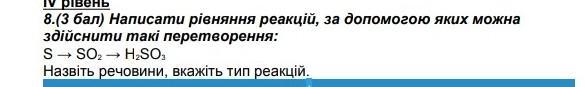 S + O2 = SO2 (згоряння); SO2 + 2NaOH = Na2SO3 + H2O; Na2SO3 + Cl2 + H2O = Na2SO4 + 2HCl (Na2SO3 + H2O2 = Na2SO4 + H2O); Na2SO4 + H2SO4 = 2NaHSO4