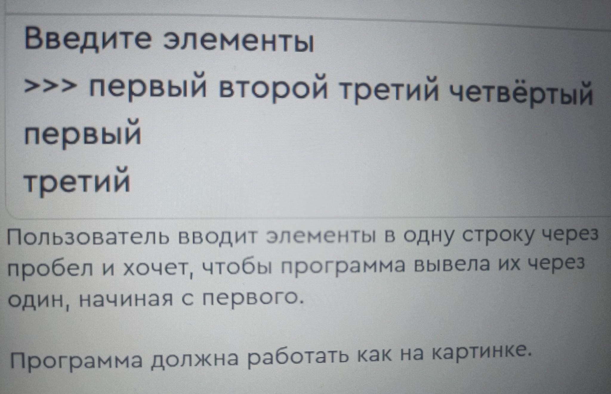 Пользователь вводит элементы в одну строку через пробел и хочет, чтобы программа вывела их через один, начиная с первого. Программа должна работать как на картинке.