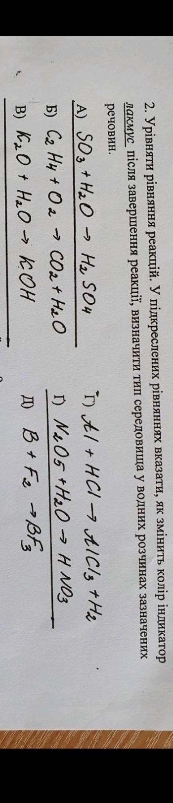 В реакціях а і ґ із-за утворення кислотного середовища лакмус змінюючи свій колір на червоний, а в реакції в, в лужному середовищі на синій колір.