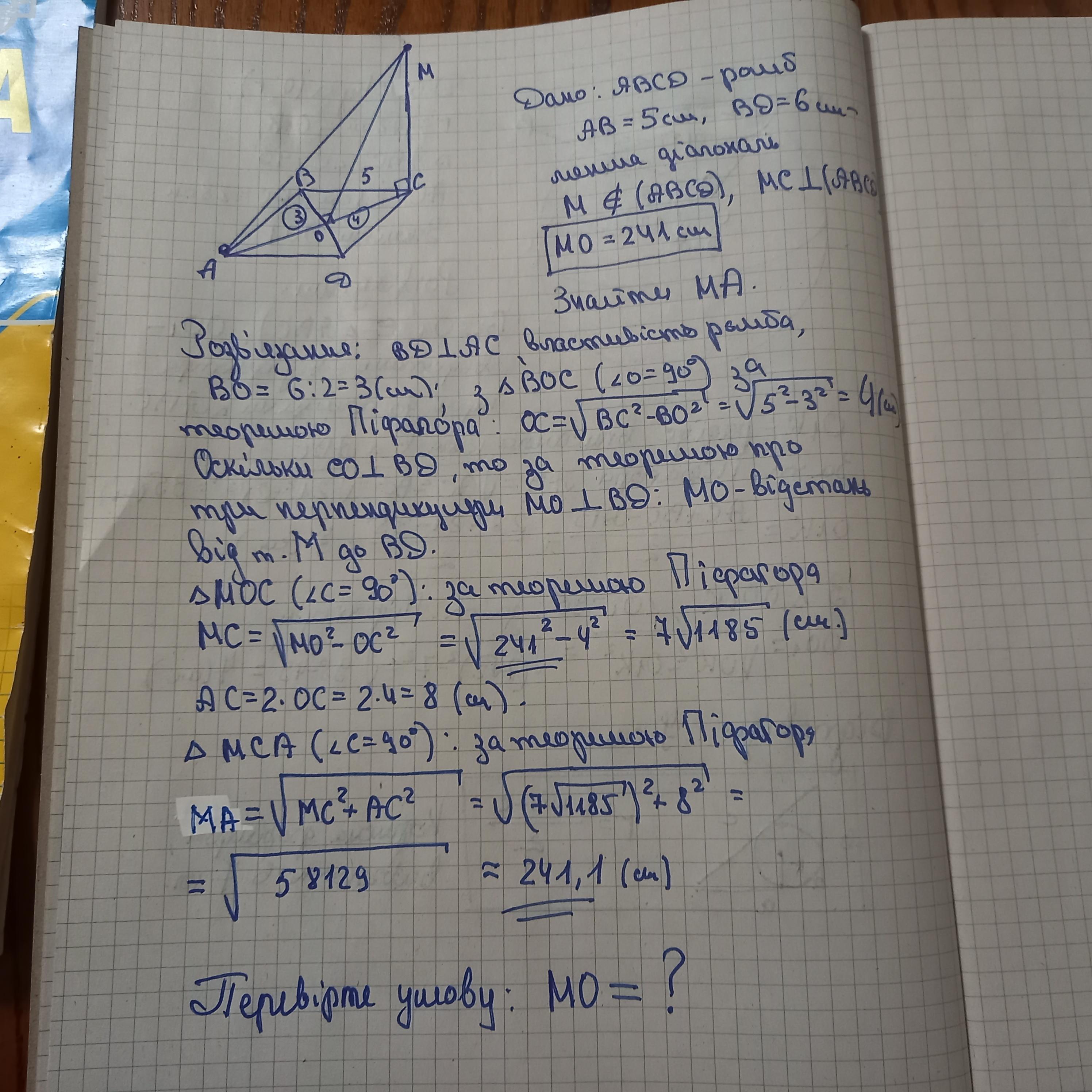 . Із деякої точки простору до площини ромба, сторона якого дорівнює 5 см, а менша діагональ 6 см, проведено перпендикуляр. Основа перпендикуляра вершина гострого кута ромба. Обчисліть від стань від цієї точки до вершини другого гострого кута, якщо відстань від даної точки до прямої, що містить меншу діагональ ромба, дорівнює 241 см.