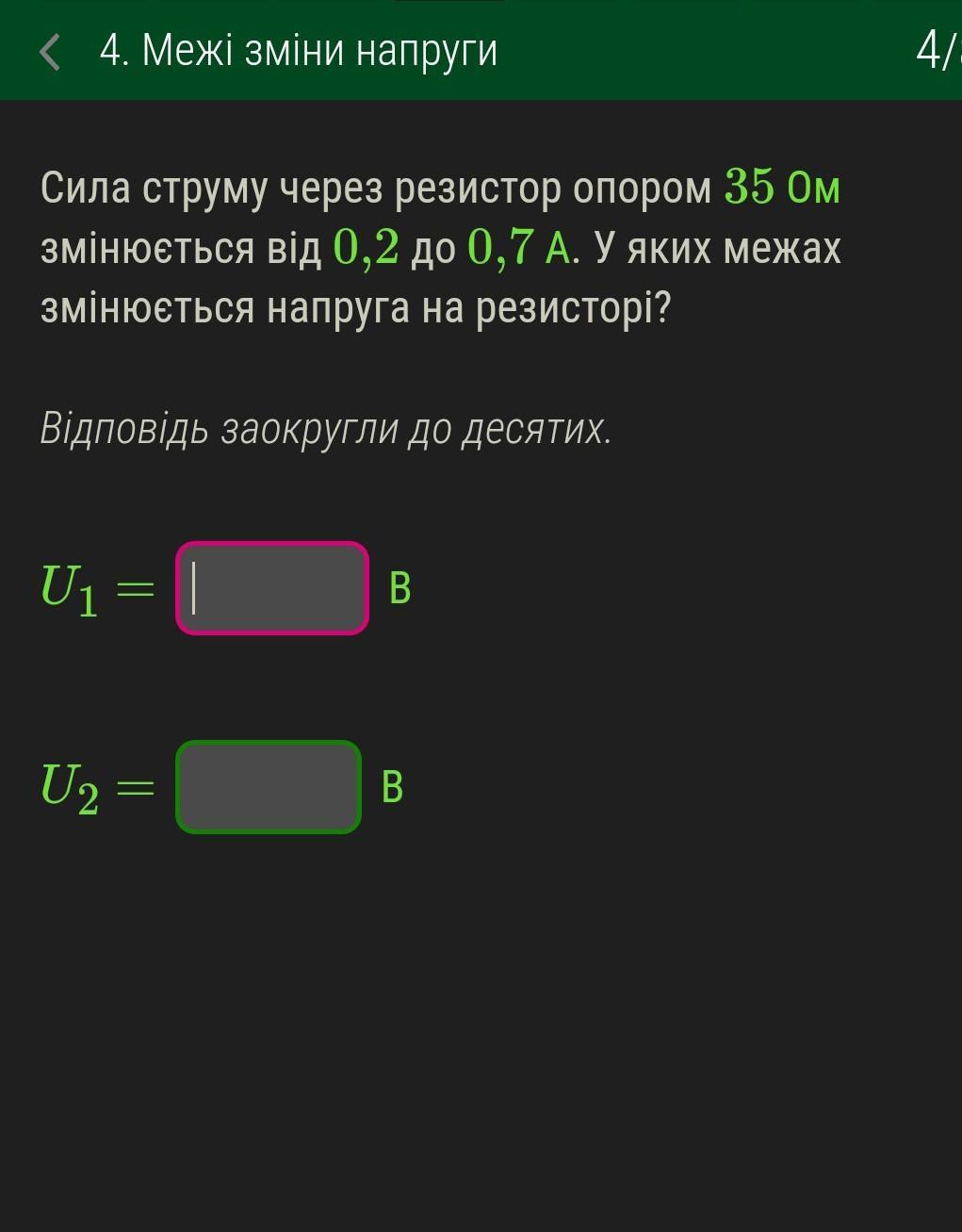 .Сила струму через резистор опором 35 Ом змінюється від 0,2 до 0,7 А. У яких межах змінюється напруга на резисторі?