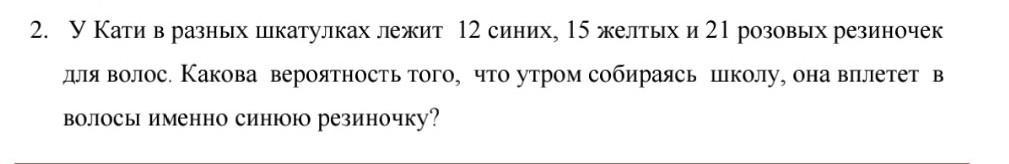 У Кати в разных шкатулках лежит 12 синих, 15 желтых и 21 розовых резиночек для волос. Какова вероятность того, что утром собираясь школу, она вплетет в волосы именно синюю резиночку?