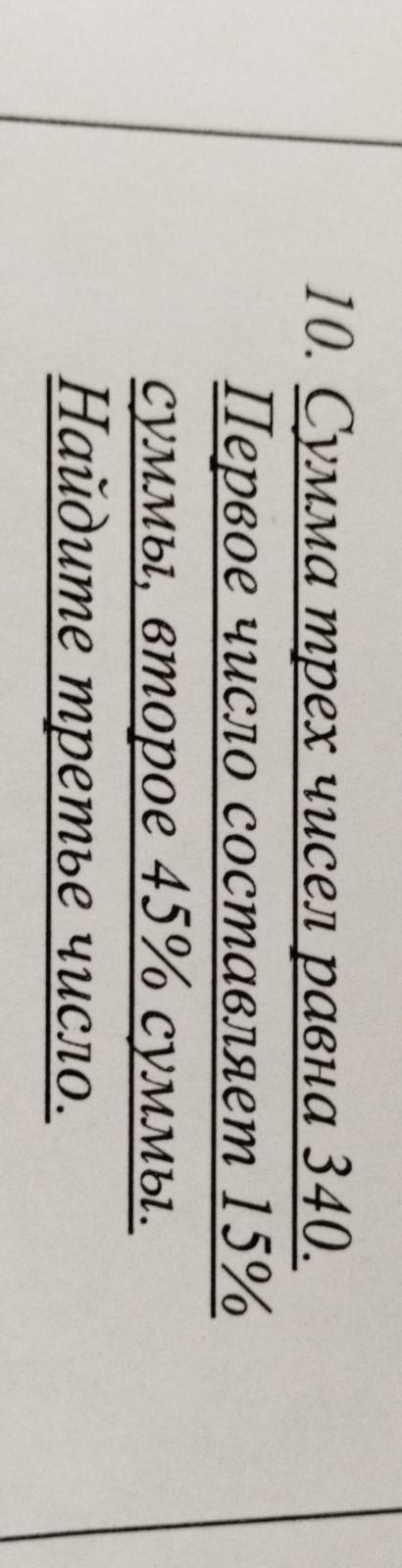 10. Сумма трех чисел равна 310. Первое число составляет 15% суммы, второе 45% суммы. Найдите мремье число.