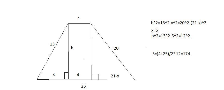 7. Длины оснований трапеции равны 25 см и 4 см, а длины боковых сторон - 20 см и 13 см. Найдите площадь трапеции. (Срочно пожалуйста сегодня сдать надо)