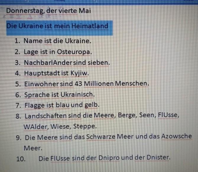 Calibri H Абзац Donnerstag, der vierte Mai Die Ukraine ist mein Heimatland 1. Name ist die Ukraine. 2. Lage ist in Osteuropa. 3. NachbarlAnder sind sieben. 4. Hauptstadt ist Kyjiw. 5. Einwohner sind 43 Millionen Menschen. 6. Sprache ist Ukrainisch. 7. Flagge ist blau und gelb. 8. Landschaften sind die Meere, Berge, Seen, FIUsse, WAlder, Wiese, Steppe. 9. Die Meere sind das Schwarze Meer und das Azowsc Meer. 10. Die FlUsse sind der Dnipro und der Dnister.