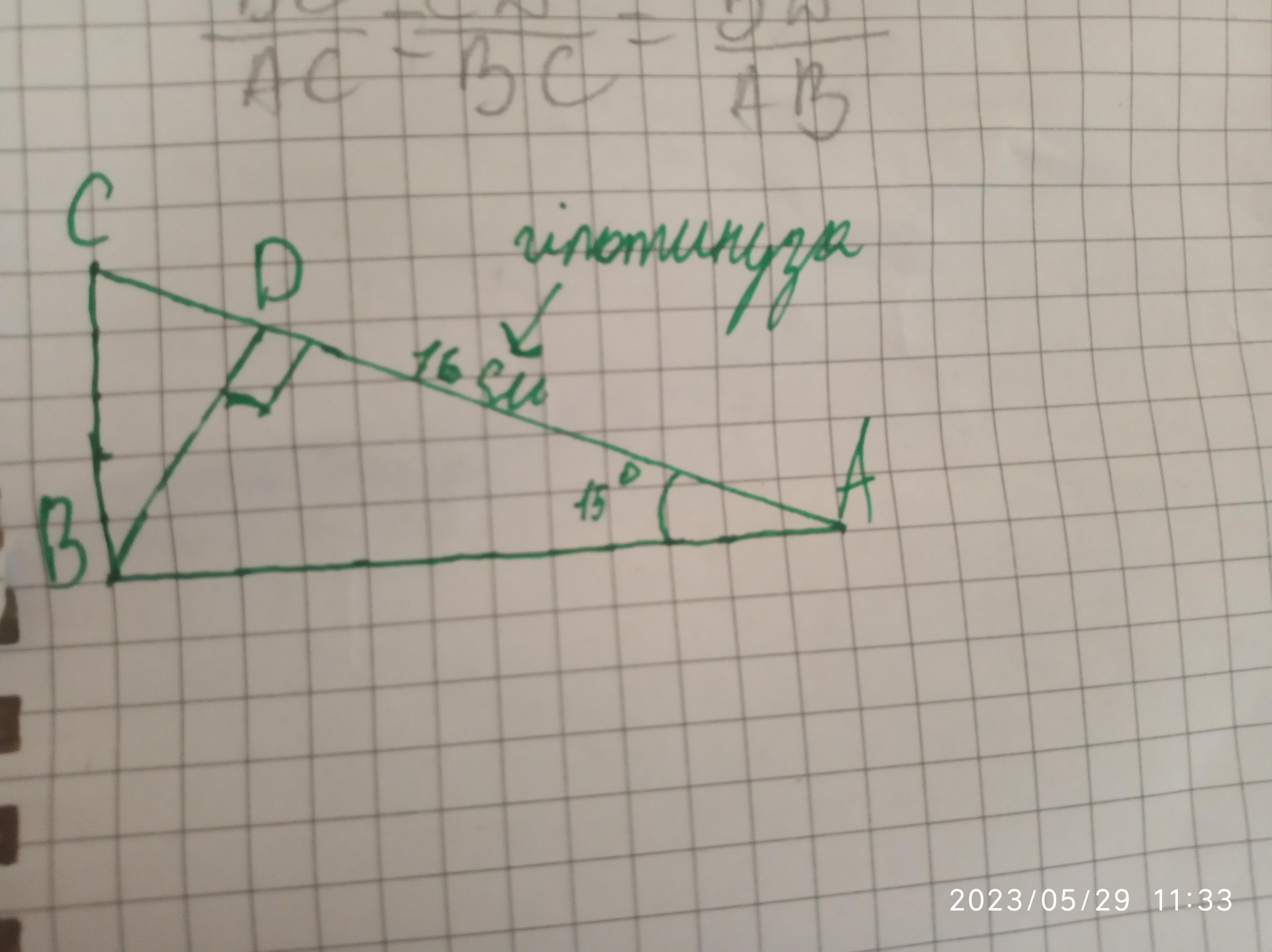 Один из углов прямоугольного треугольника равен 15°. Найти высоту проводимую с вершины прямого угла если гипотинуза треугольника равна 16см