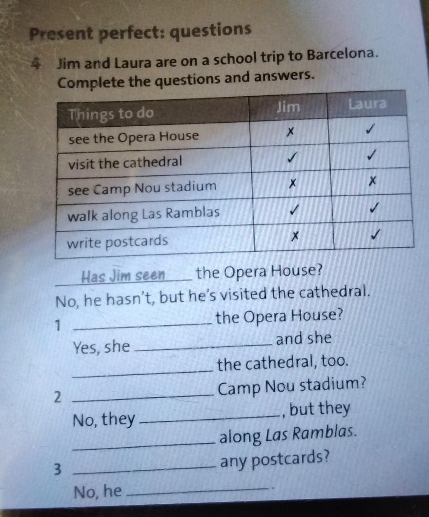 Present perfect: questions 4 Jim and Laura are on a school trip to Barcelona. Complete the questions and answers. Things to do Jim see the Opera House X visit the cathedral 2 see Camp Nou stadium walk along Las Ramblas write postcards 3 Yes, she No, they ✓ No, he X ✓ Has Jim seen the Opera House? No, he hasn't, but he's visited the cathedral. 1 X Laura the Opera House? and she X the cathedral, too. Camp Nou stadium? ., but they along Las Ramblas. any postcards? ✓