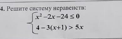 \displaystyle\bf\\\left \{ {{ {x}^{2} - 2x - 24 \leqslant 0 } \atop {4 - 3(x + 1) > 5x }} \right. \\ \\ 1) \:  {x}^{2}  - 2x - 2 \leqslant 0 \\  {x}^{2}  - 2x - 24 = 0 \\ po \:  \:  \: teoreme \:  \:  \: vieta \\  {x}^{2}   + bx + c = 0\\ x_{1}  +  x_{2} =   - b\\ x_{1} x_{2} = c  \\  \\ x_{1}  +  x_{2} = 2 \\ x_{1} x_{2} =  - 24 \\ x_{1} =  6\\ x_{2} =  - 4 \\  \\ {ax}^{2}  + bx + c = a(x - x_{1})(x - x_{2}) \\  {x}^{2}  - 2x - 24 = (x - 6)(x + 4) \\  \\ (x - 6)(x + 4) \leqslant 0 \\  +  +  + [ - 4] -  -  - [6] +  +  +  \\  - 4 \leqslant x \leqslant 6 \\  \\ 2) \: 4 - 3(x + 1) > 5x \\ 4 - 3x - 3 - 5x > 0 \\  - 8x >  - 1 \\ x < 0.125 \\  \displaystyle\bf\\\left \{ {{ - 4 \leqslant x \leqslant 6} \atop {x < 0.125 }} \right. \\ \\ x \: \epsilon \: [ - 4; \: 0.125)