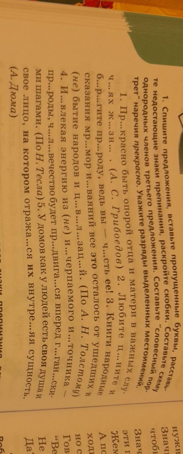 1. Спишите предложения, вставьте пропущенные буквы, составь- "словесный портрет", слова прекрасный. . 1. Пр...красно быть опорой отца и матери в важных слу- (А. С. Грибоедов) 2. Любите ц...ните и ч...сть ее! 3. Книги народные сказания мр...мор и...ваяний все это осталось от ушедших в (не) бытие народов и ............. (По А. Н. Толстому 4. И...влекая энергию из (не) и... черпаемого и... точника пр...роды, ч........вечество будет пр...двига...ся вперед г...ган...ски- ми шагами. (По Н. Тесла) 5. У домов как у людей есть своя душа и свое лицо, на котором отража...ся их внутре...яя сущность. (А.Дюма)
