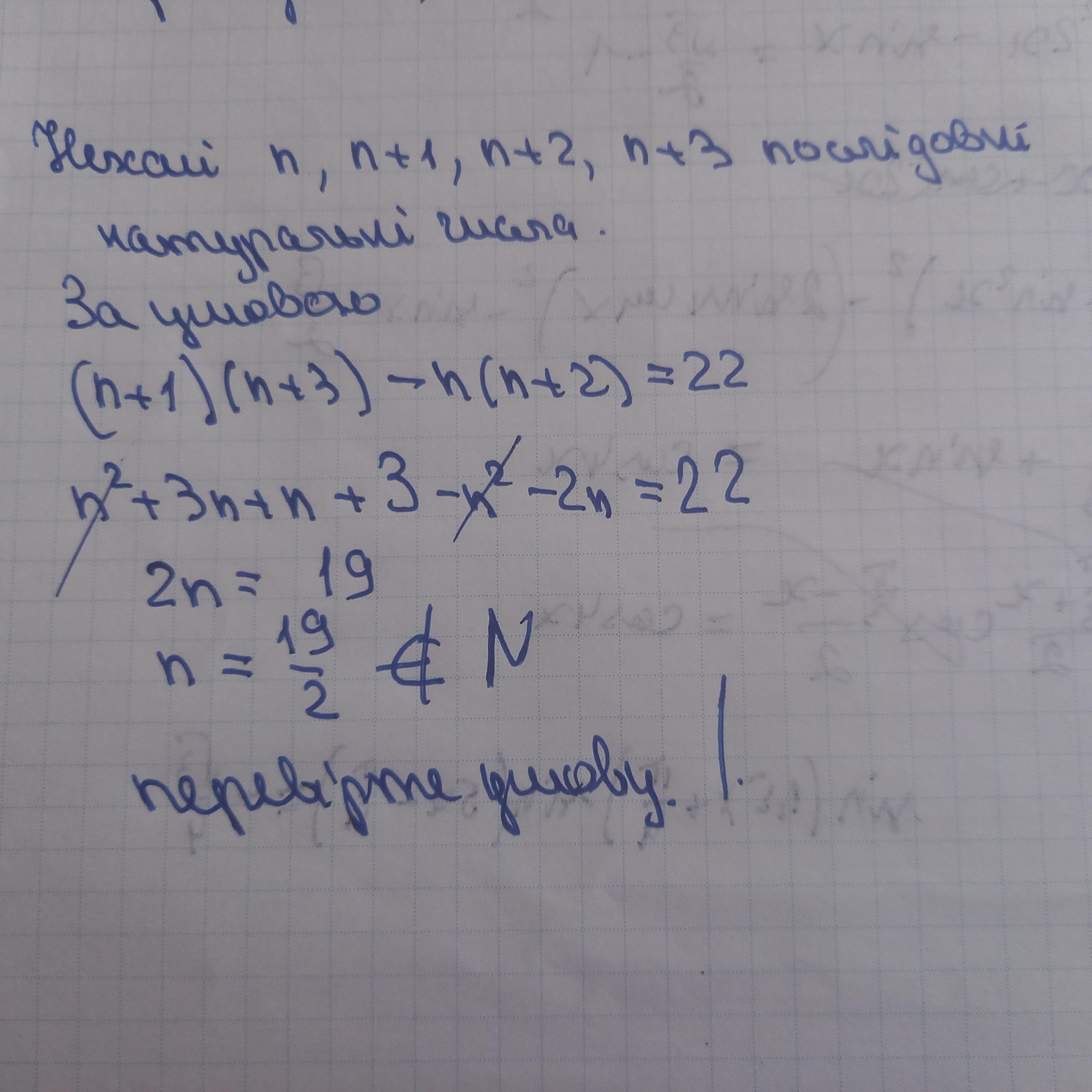Знайдіть 4 послідовних натуральних числа,якщо відомо,що добуток другого та четвертого більший за добуток першого і третього на 22