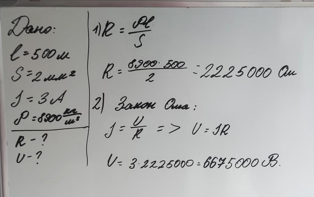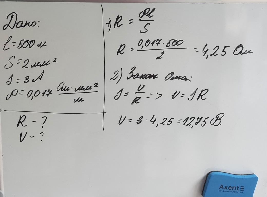 Знайти опір мідного провідника довжиною 500 метрів і площею поперечного перерізу 2 мм2. Яка напруга на кінцях цього провідника, якщо в ньому тече сила струму 3 А?