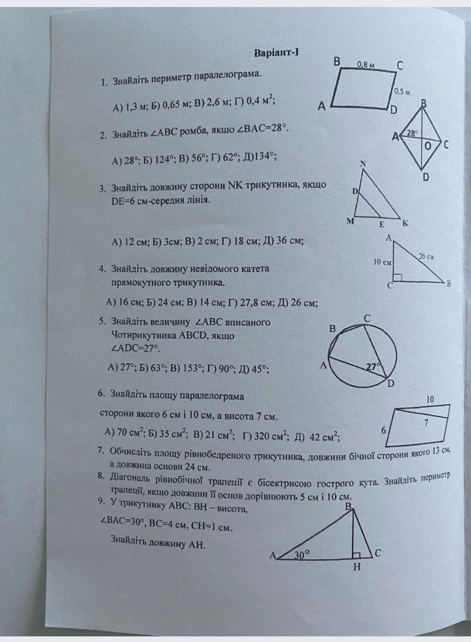 1.Периметр паралелограма ABCD складається з суми довжин його сторін. За умовою, сторона BC дорівнює 0,8 метра, а сторона CD дорівнює 0,5 метра. Оскільки паралелограм має протилежні сторони паралельні і рівні, то сторона AB дорівнює BC, а сторона DA дорівнює CD. Тому: