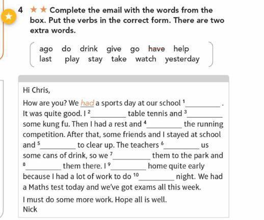 1.yesterday 2. Was playing 3. Did 4. Watched 5. Helped (?) 6. Offered (extra word) ? 7. Took 8, drank 9. Get 10. At? / потому что stay сюда без предлога to не всунуть , я не уверен до конца что это правильно но я пытался