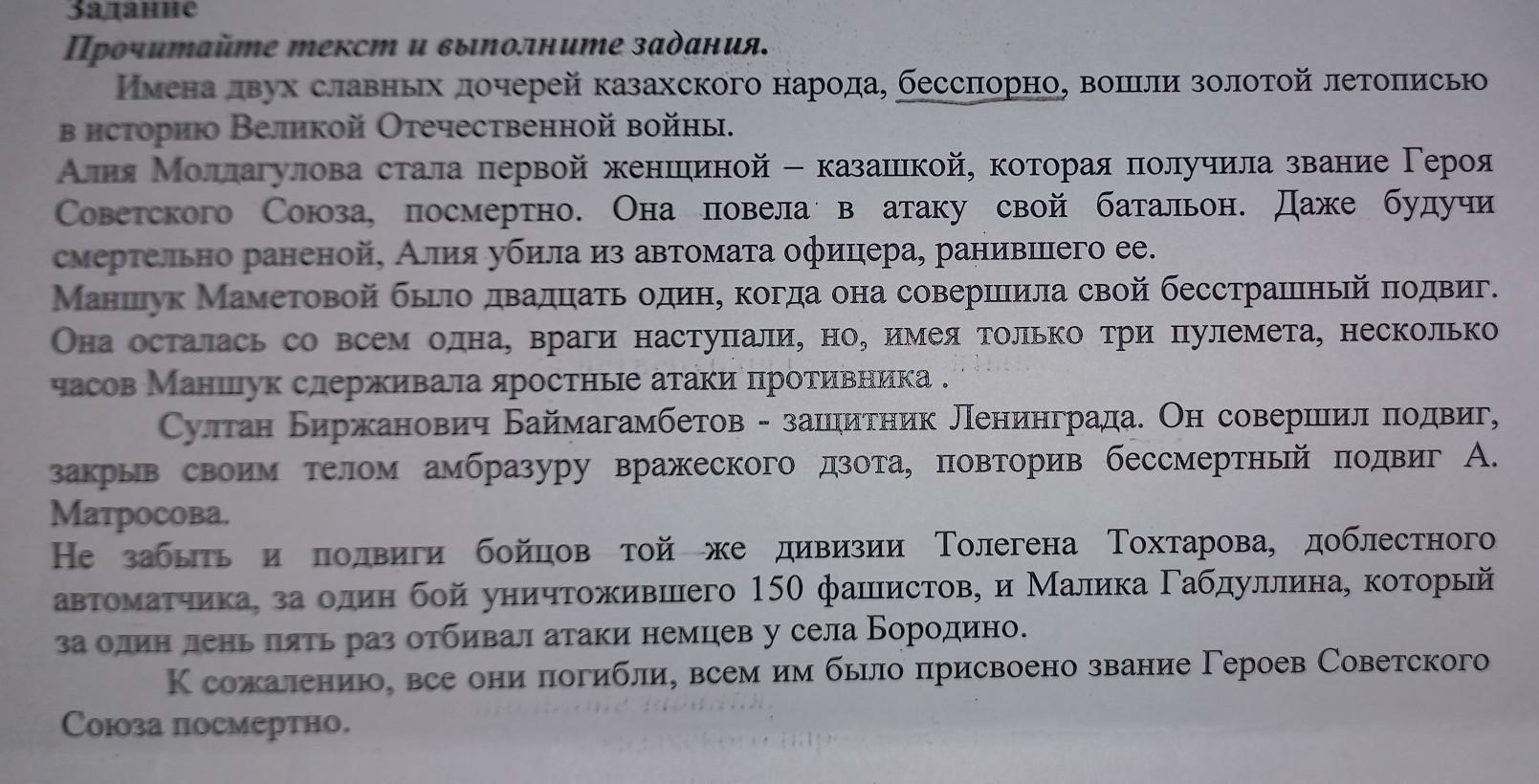 Не забыть и подвиги бойцов той же дивизии Толегена Тохтарова, доблестного автоматчика, | за один бой уничтожившего 150 фашистов |, и Малика Габдуллина, который за один день пять раз отбивал атаки немцев у села Бородино.