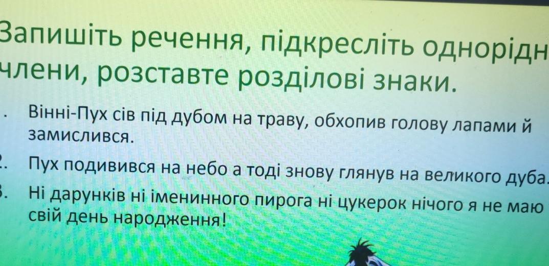 Запишіть речення, підкресліть однорідні члени, розставте розділові знаки. 1. Вінні-Пух сів під дубом на траву, обхопив голову лапами й замислився. 2. 3. Пух подивився на небо а тоді знову глянув на великого дуба. Ні дарунків ні іменинного пирога ні цукерок нічого я не маю у свій день народження!
