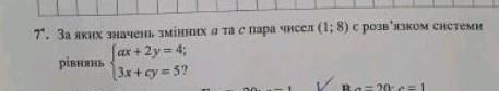 ax + 2y = 4 \\ 3x + cy = 5 \\  \\ a \times 1 + 2 \times 8 = 4 \\ 3 \times 1 + c \times 8 = 5 \\ \\ a =  - 12 \\ 8c = 2 \\  \\ a =  - 12 \\ c =  \frac{1}{4}