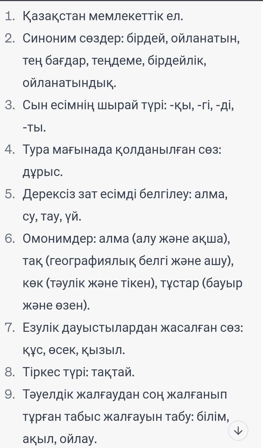 1. Қазақстан қандай мемлекет? 2. Синоним сөздерді көрсетіңіз. 3. Сын есімнің шырай түрін белгілеңіз.Апамның пісірген ірімшігі өте дәмді. 4. Тура мағынада қолданылып тұрған сөзді көрсетіңіз. 5. Дерексіз зат есімді белгілеңіз. 6. Омонимдерді көрсетіңіз. 7. Езулік дауыстылардан жасалған сөзді көрсетіңіз. 8. Тіркес түрін анықтаңыз: Жұқа тақтай. 9. Тәуелдік жалғаудан соң жалғанып тұрған табыс жалғауын табыңыз. 11. «Қол ұшын беру» деген тіркестің түрін көрсетіңіз. 12. Ілік септігіндегі жалғаулы сөз бен тәуелдік жалғаулы сөздің байланысу түрін анықтаңыз. 13. «Қой аузына шөп алмас» фразеологиялық тіркесінің антонимін табыңыз. 14. Жасырын тұрған табыс жалғаулы тіркесті көрсетіңіз. 15. Салыстырмалы шырайда тұрған сөзді көрсетіңіз. 16. Ұяң дауыссыз дыбысқа аяқталған сөзді көрсетіңіз. 17. Қазақстанның тұңғыш астанасын көрсетіңіз. 18. Сөйлемді толықтырыңыз: Ата заң күні ... тойланады. 19. Қазақ тілі мемлекеттік мәртебе алған жылды көрсетіңіз. 20. Бір ғана сөз есімдіктің бір түрін жасайды.. 21. Есептік сан есімді көрсетіңіз. 22. «Әдейі келу» сөз тіркесінің лексика-грамматикалық мағынасын көрсетіңіз. 23. «Мақсатым- тіл ұстартып, өнер шашпақ» - сөзінің авторы. 24. «Сыңар» сөзінің қай сан есіммен синонимдес екенін көрсетіңіз. 25. «Тайға таңба басқандай » деген тұрақты тіркестінің мағынасын табыңыз. 26. Тәуелдік жалғауының ушінші жағында тұрған сөзді табыңыз. 27. Лексика нені зерттейді? 28.Сөйлемді толықтырыңыз: Қазақстан Республикасының ... тілі - қазақ тілі. 29. Мақалды аяқтаңыз: Білім сандығы - … . 30. Тиісті қосымшаны жалғаңыз: Көкпар – ұлт... ат ойыны. 31. Қазақстан Республикасы қай жылы тәуелсіздігін алғанын анықтаңыз. 32. Сөйлемді толықтырыңыз:Сөйлемнің тұрлаусыз мүшелері - ... . 33.Қазақстанның мемлекеттік рәміздері бекітілген жылын анықтаңыз. 34. Асты сызылған сөз сөйлемнің қай мүшесі екенін көрсетіңіз: Маусым айында сессия басталады. 35. Сіз тұратын өлкені көрсетіңіз. 36. Сөйлемді толықтырыңыз: Қазақ театрының тарихында сахнада қойылған тұңғыш пьеса ... 37. Тиісті тәуелдік жалғауын қойыңыз: Біздің оқу орны... . 38. «Қымбат» сөзінің антонимін көрсетіңіз.39. «Алғашқы» сөзінің синонимдерін көрсетіңіз. 40. Көптік жалғауы бар сөзді көрсетіңіз. 41. Зат есім нені білдіретінін көрсетіңіз. 42. Дұрыс жауабын көрсетіңіз: Кімнің оқулығы? 43. Сын есім нені білдіретінін көрсетіңіз. 44. Тиісті жұрнақты көрсетіңіз: Қазақ тілі 1989 жылы мемелекет... мәртебе алды. 45. «Мейірімді» сөзіндегі дауыстылар санын көрсетіңіз. 46. Реттік сан есімнің жұрнақтарын көрсетіңіз. 47. Жинақтық сан есімді көрсетіңіз. 48. Мұхтар Әуезовтің кім екенін көрсетіңіз. 49. «Главные персонажи» сөз тіркесінің дұрыс аудармасын көрсетіңіз. 50. Мақалды аяқтаңыз: Көп сөз – көмір, аз сөз - ... . 51 «Не показываться в глаза» сөзінің аудармасын көрсет 52. Қазақтың діни мерекесін көрсет 53. Ж.Аймауытов кім? 54. «Наследство» сөзінің аудармасын көрсет 55. Негізгі үстеуді көрсет 56. Ы.Алтынсарин шығармасын көрсет? 57. Сөйлемді аяқта Радио тыңдарман үшін аса.... 58. Мәриям Сейдалина деген кім? 59. «Байланыс» дегеніміз не? 60. Қазақ телевизиясының тұңғыш дикторын көрсет 61. Көп нүктенің орнына дұрыс сөзді қой Пластмассадан жасалынған бұйымдарды .... қиын 62. «Жер мен аспан арасындағы дастан» шығармасының авторы кім? 63. Көп нүктенің орнына дұрыс сөзді қой Ақын болып туады, ..... болып қалыптасады. (Цицерон) 64. «Пима» деген не? 65. Нашақорлық.... сөйлемді аяқта 66. Сандық технология... тез